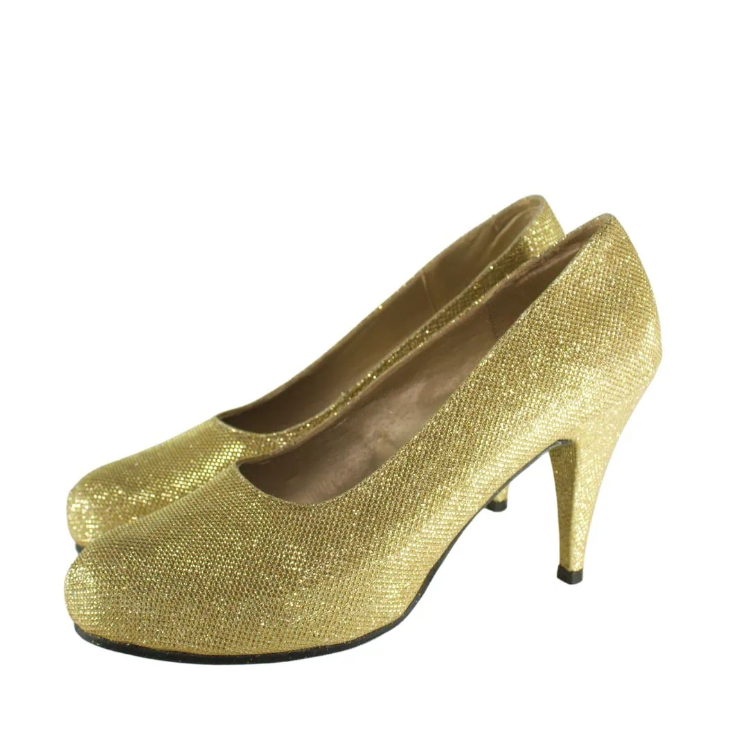 Zapato cerrado en tono dorado con brillos, ideal para destacar con glamour y sofisticación en cualquier ocasión.